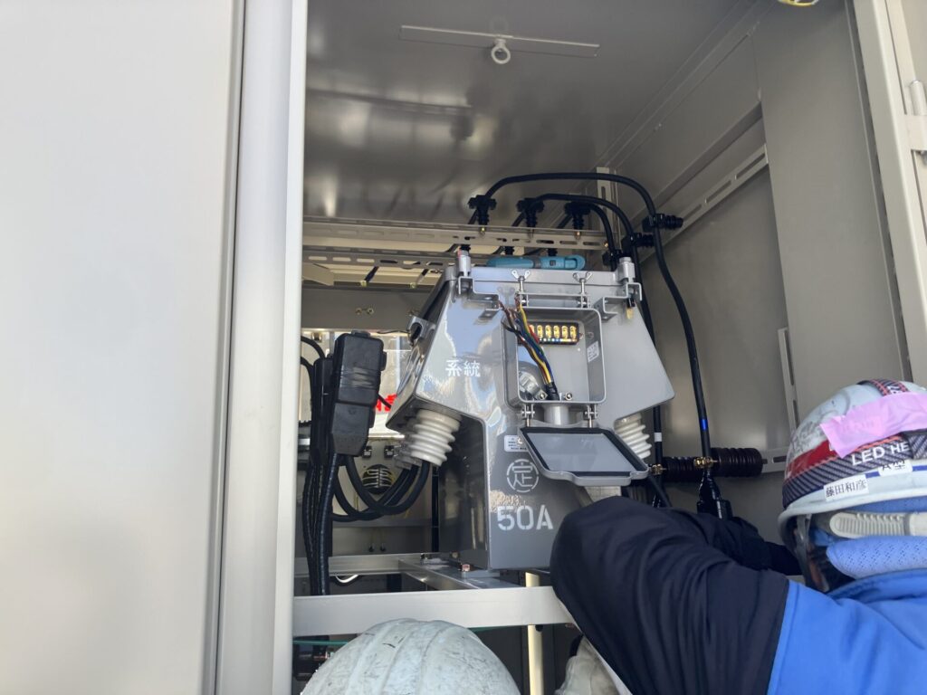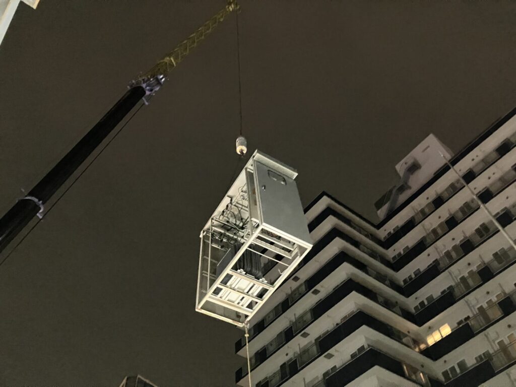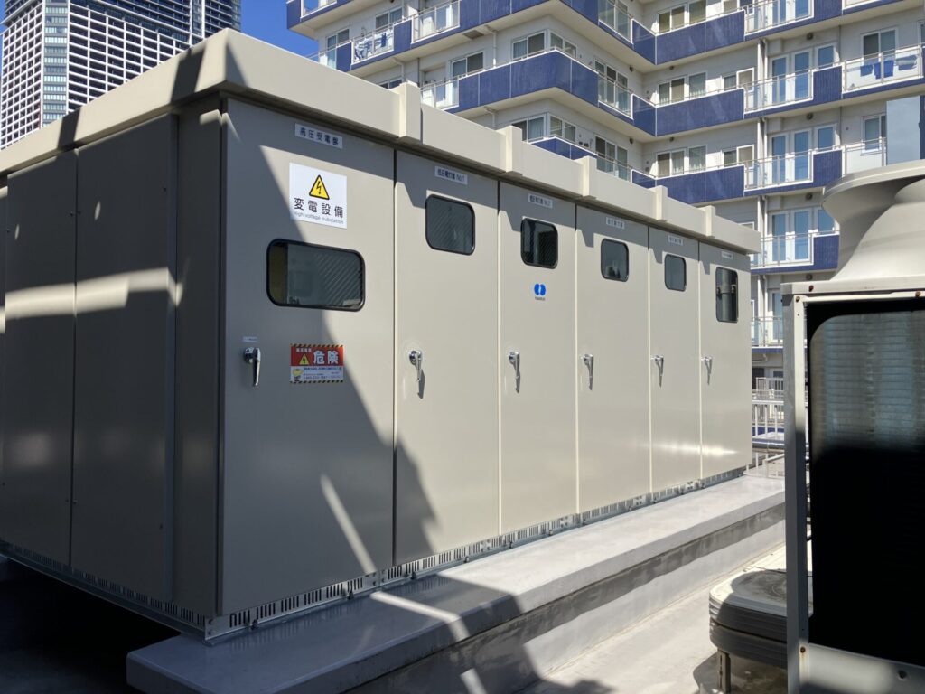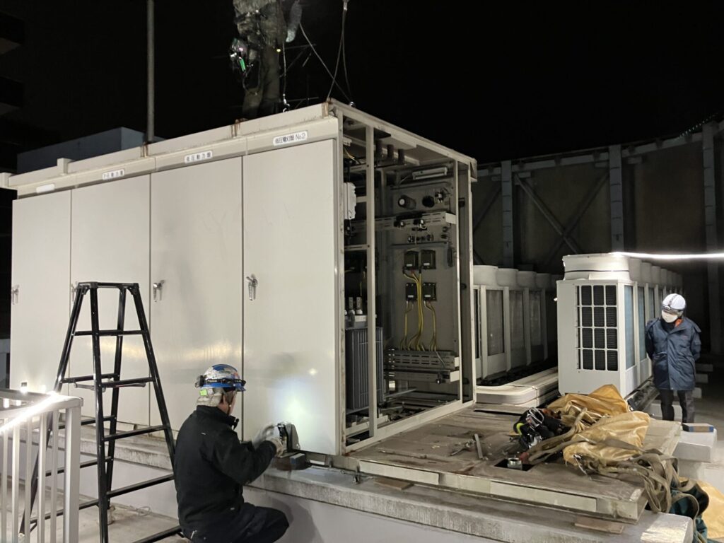 某商業ビル屋上キュービクル更新工事 2026年04月02日 一般的にキュービクルは20年〜25年が更新の目安とされています。老朽化した設備を放置すると、突発的な停電や火災、波及事故(近隣一帯を巻き込む停電)のリスクが高まるため、計画的な更新が重要です。